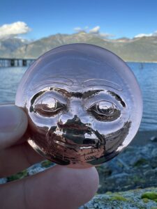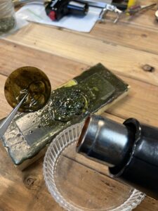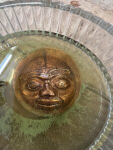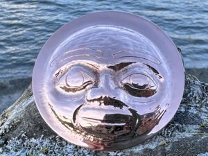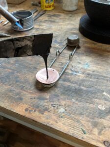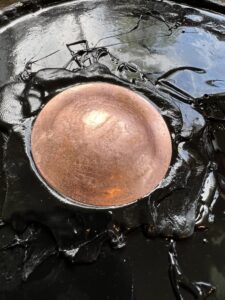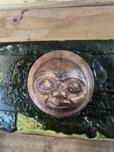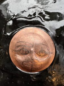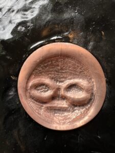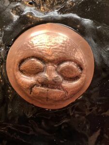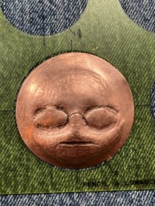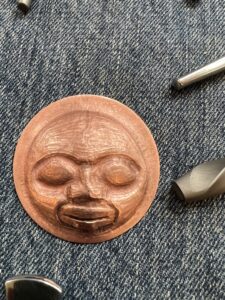 Now that the chasing and reprouse is done it is time to draw on the eyes and eyebrows. Set it in engravers wax then engrave. Engraving on curved surfaces on metal that has been pounded on many times over is quite challenging.