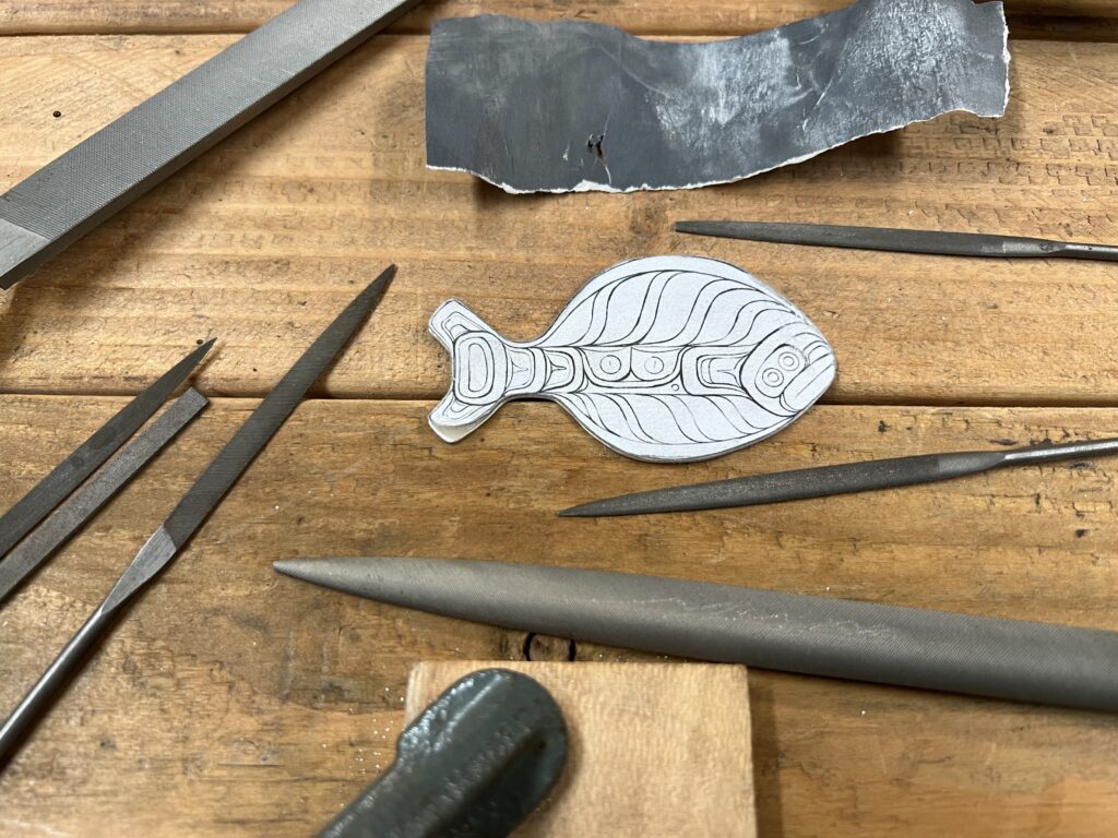 Greg and I were looking forward to the next project. Something that involved a little bit of metal forming along with soldering. Greg came up with the idea of a Halibut pendant. Ok, so I head back home and start studying Halibuts. Get a real idea of how their body looks. I have caught plenty but not enough to recall from memory.
