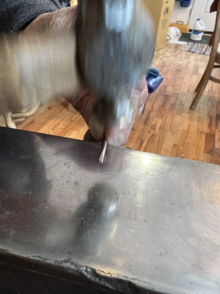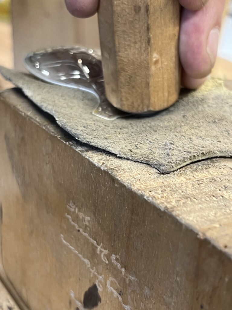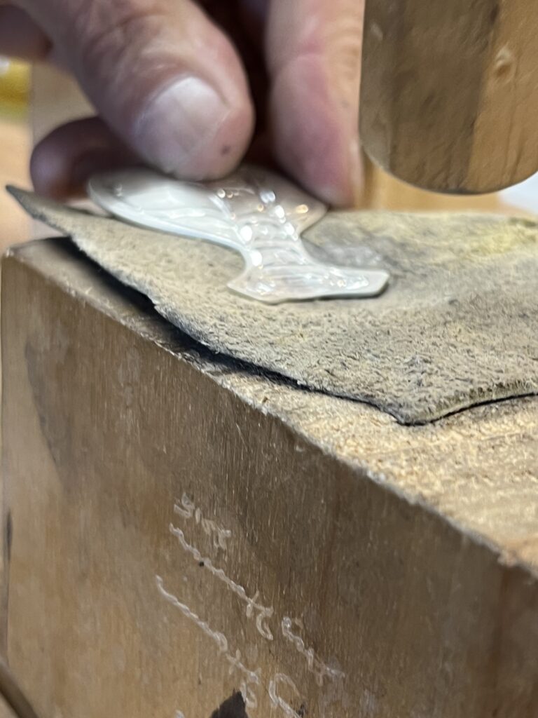 Getting ready to pop the tail the way. We do this with a mixture of using wooden dapping tools and leather to try and not mar the silver.