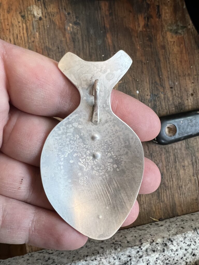 Next I carefully file all my edges down, Next I engrave, then form my piece. Basically just means I pop the metal out a bit. After that I polish and clean which is no fun.