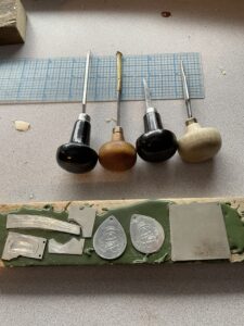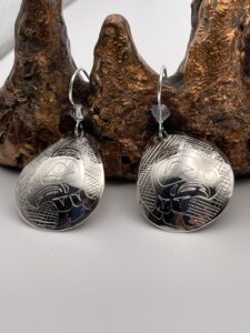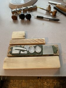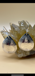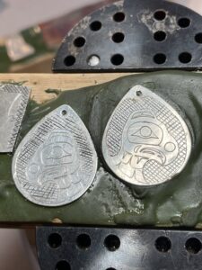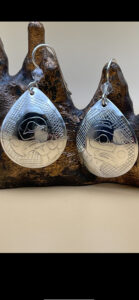 I’m really getting my toes wet now, it feels good seeing a piece start to finish. I’m excited to see many more I’ve got a long way to go also I’m seeing many improvements. Working with silver is proving to be a fun medium. I can also really appreciate all of the work and detail that go into nice pieces. With the earrings Jenny let me use an Eagle design of hers. I crosshatched it made a border. Then pounded it with a mallet and a norm block to get it to the right shape. After that they were polished and cleaned and then signed. These will be my first piece and they went to my wife for a Christmas present.