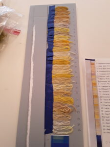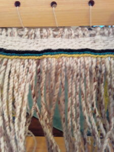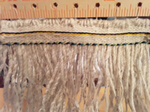 The braids really stood-out to me while at the museum, perhaps this is because I have been learning to braid on my small beginner piece.  I remember when I first began the braiding process that it was pretty difficult for me, so Marsha had me do a single braid with three different colored strands.  Braids should be one color, but as this is new to me, it was easier to grasp this concept being able to see the three colors coming together in a pattern.  Now I am able to create the braids all in a single color.