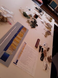 We visited The Alaska State Museum in Juneau, AK in order to study some of the robes in their collection.  I wasn’t too sure what to expect when we went, but the experience exceeded my expectations.  Ellen Carrlee, the conservator there, first took us to a room where they have been experimenting with different natural dyes.  Upon entering the room, we were greeted by a mountain goat who stood rather majestically upon his mounted rock.  Seeing the mountain goat was a good reminder of the work and preparation that has to take place way before a weaving is ever started. It was also a reminder of how closely entwined the blankets are to the land here. The weft yarns were in different sections on the table depending on color groups and labeled with what had been used to dye them.  The materials used varied greatly.  We saw anything from chocolate bar wrappers to copper tubes to lichen wolf mosses, to name just a few of the things. It was fascinating seeing the varying colors.