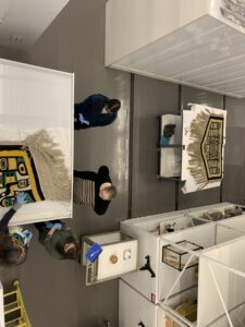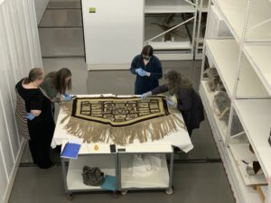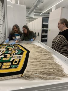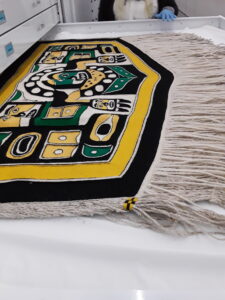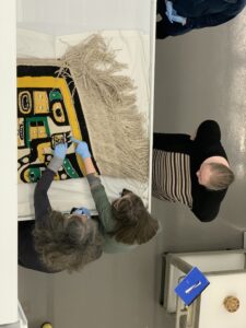 From there we went into another room of the museum’s archives.  This was a large room filled with all kinds of artifacts and collectibles of varying kinds: taxidermy, boats, a beaded tunic, an old desk, baskets, and tucked into a corner was where the Chilkat robes are kept.  The first robe we studied was laying out on a table ready for us.  As we started to look and examine the weaving, I realized that these robes have much to say.  That day they reminded me of the weavers of the past and how they continue to teach us to this day.  I was seeing hands that created, hearts that designed, and the braids that held so much beauty.  I felt the importance of our history dancing and moving about us, encircling our present to move forward with grace into the future.