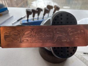 I haven’t carved a whole lot of copper I do have an affinity towards the material. Copper is more traditional and it has healing and protective properties. It is also tricky to carve. The copper isn’t consistent in nature there are hard spots and soft spots you have to be ready when there is a hard spot you could slip out then your tool can slice right into a soft spot for an unwanted gash. With this in mind I had to change my approach and took a pause when I ran into a tricky spot in the copper.