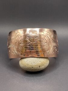 I’m grateful for the use of this design it is an AIA design of an emerging frog out of hibernation. It really helps seeing how the designs are laid out using a certain ratio of forms throughout. There are lots of 3’s in formline and you see it in bracelets. The design and be split up into 3’s and you see it with the main head and then the legs and a Raven head at the ends. You can also say the design is split like if you split the back of a design and split it so it was Facing forward you can take something that is 3D in nature and put it on something 2D and still get all of the design features or body parts on a piece. Something that was thought up a long time ago and is very clever.